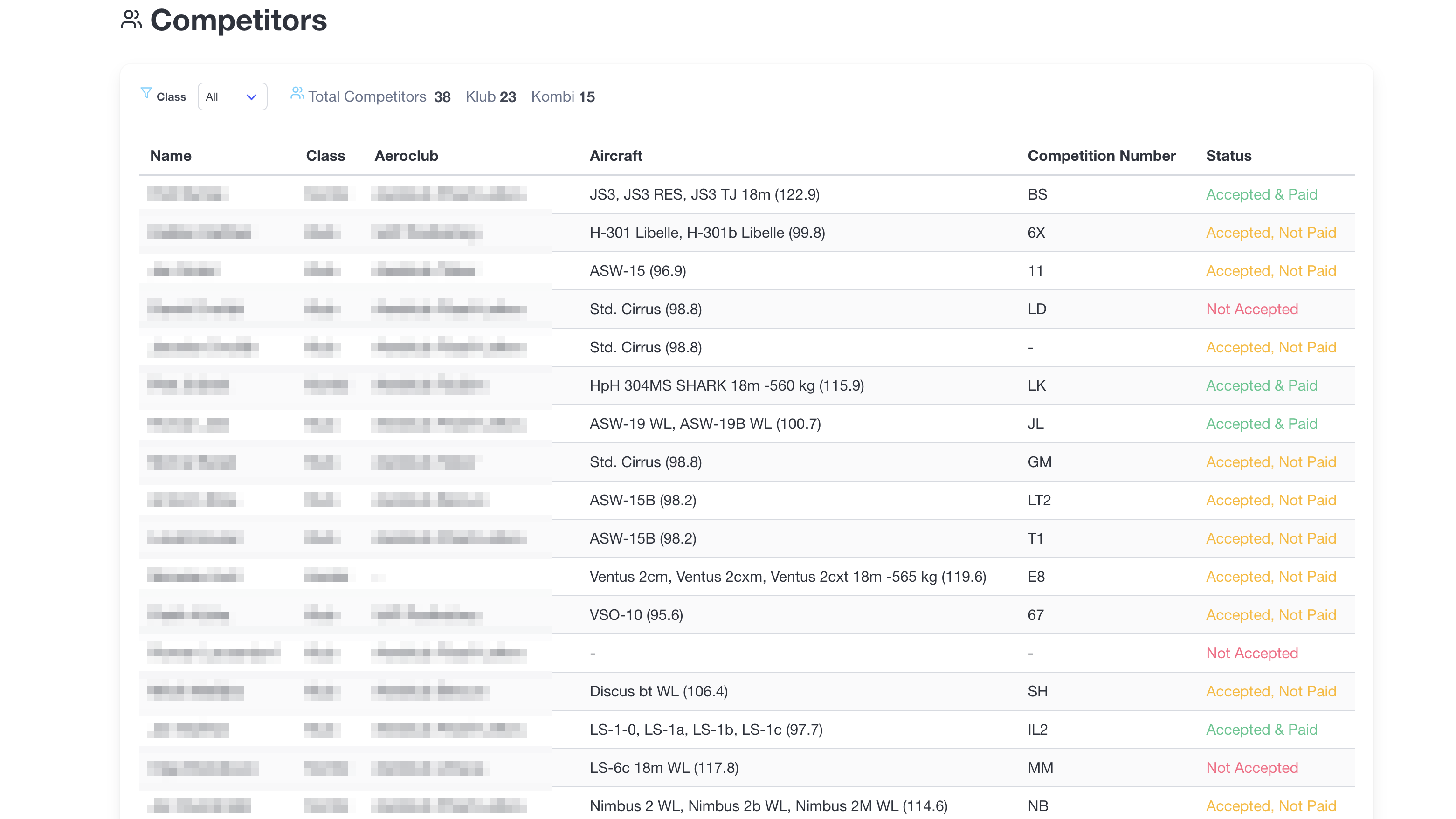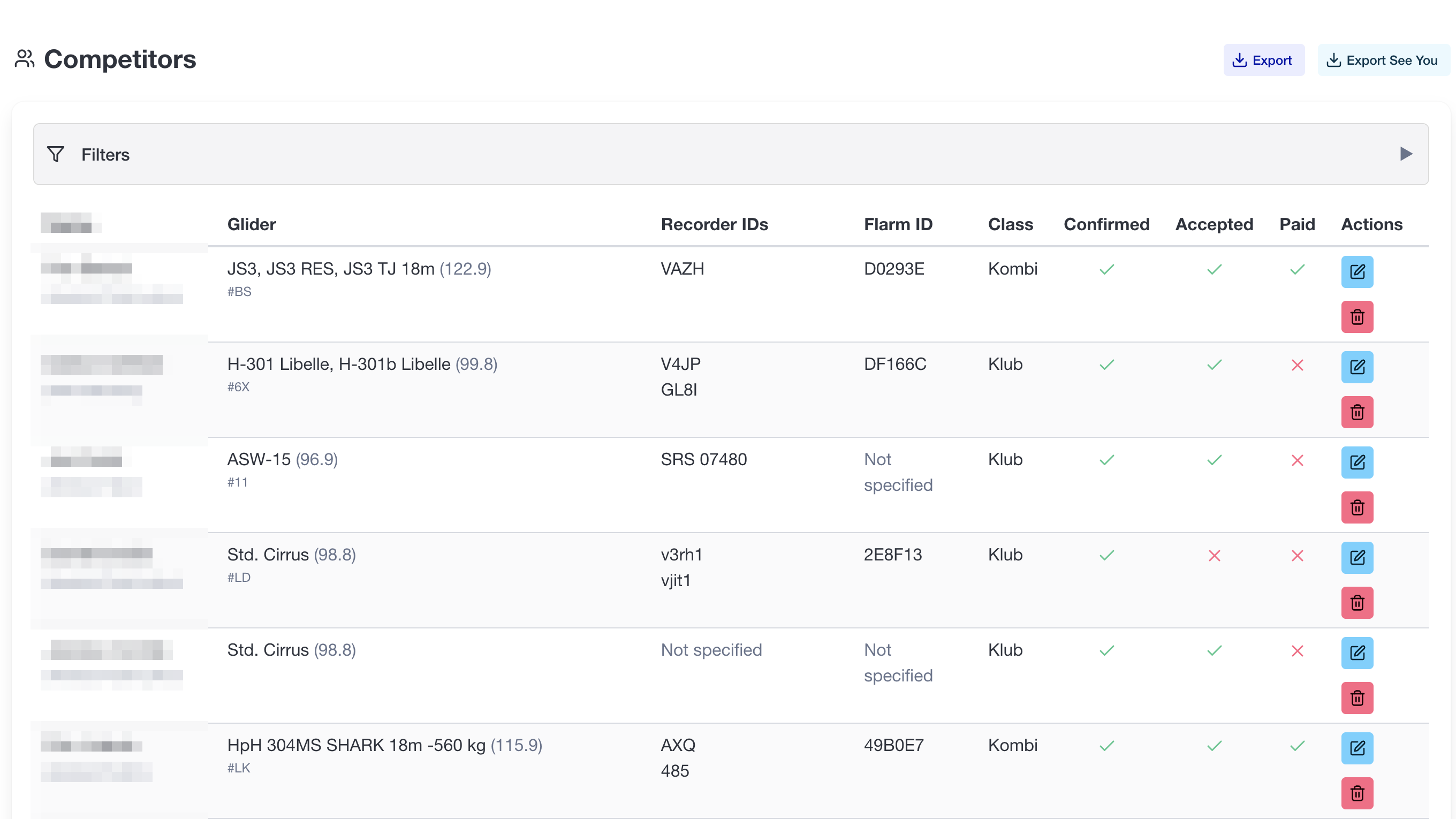 Share the link with pilots. They register themselves with glider selection, aeroclub info, and all necessary details.