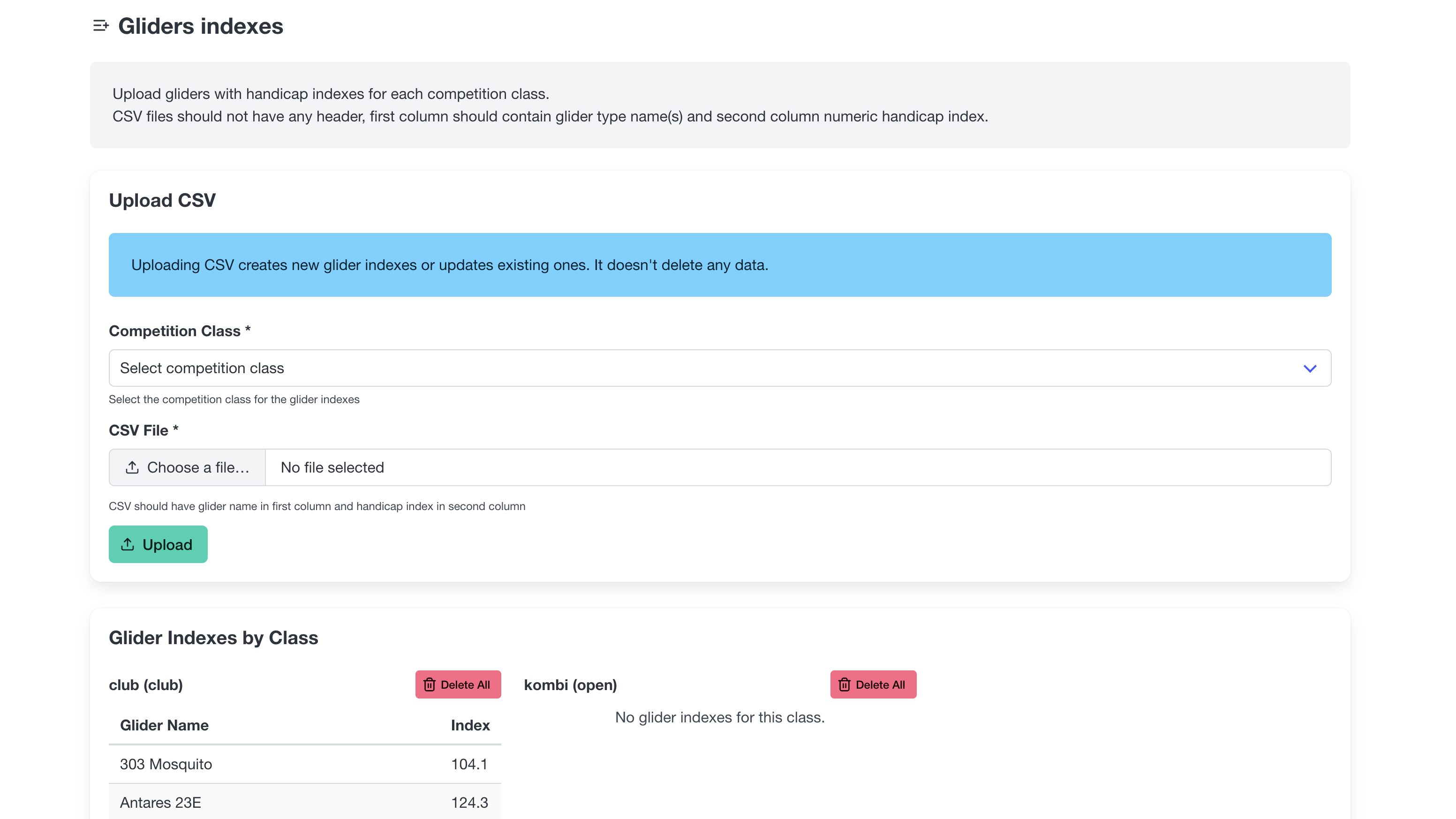 Competition classes are synchronized from Soaringspot. Upload glider handicap lists for each class.