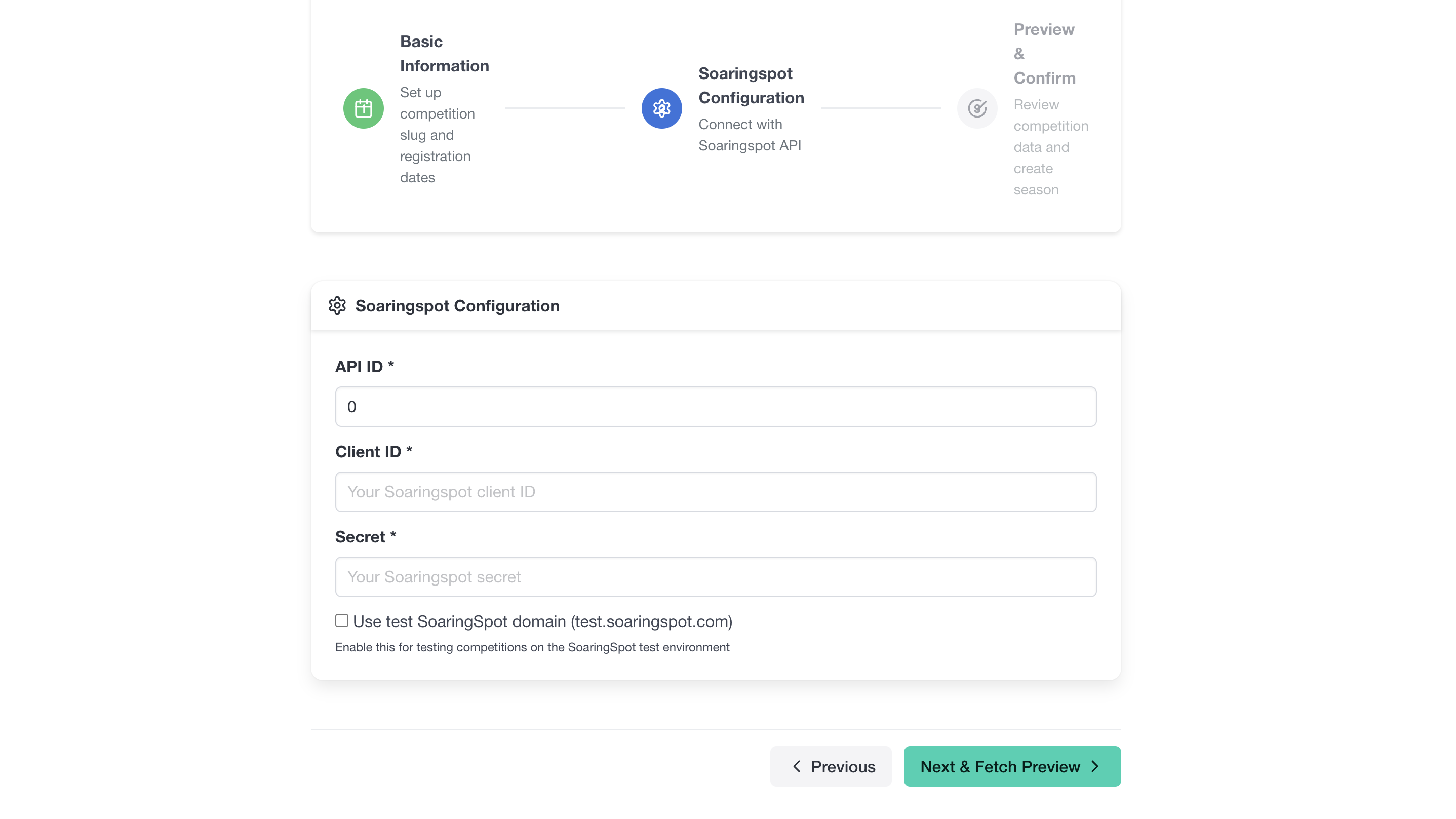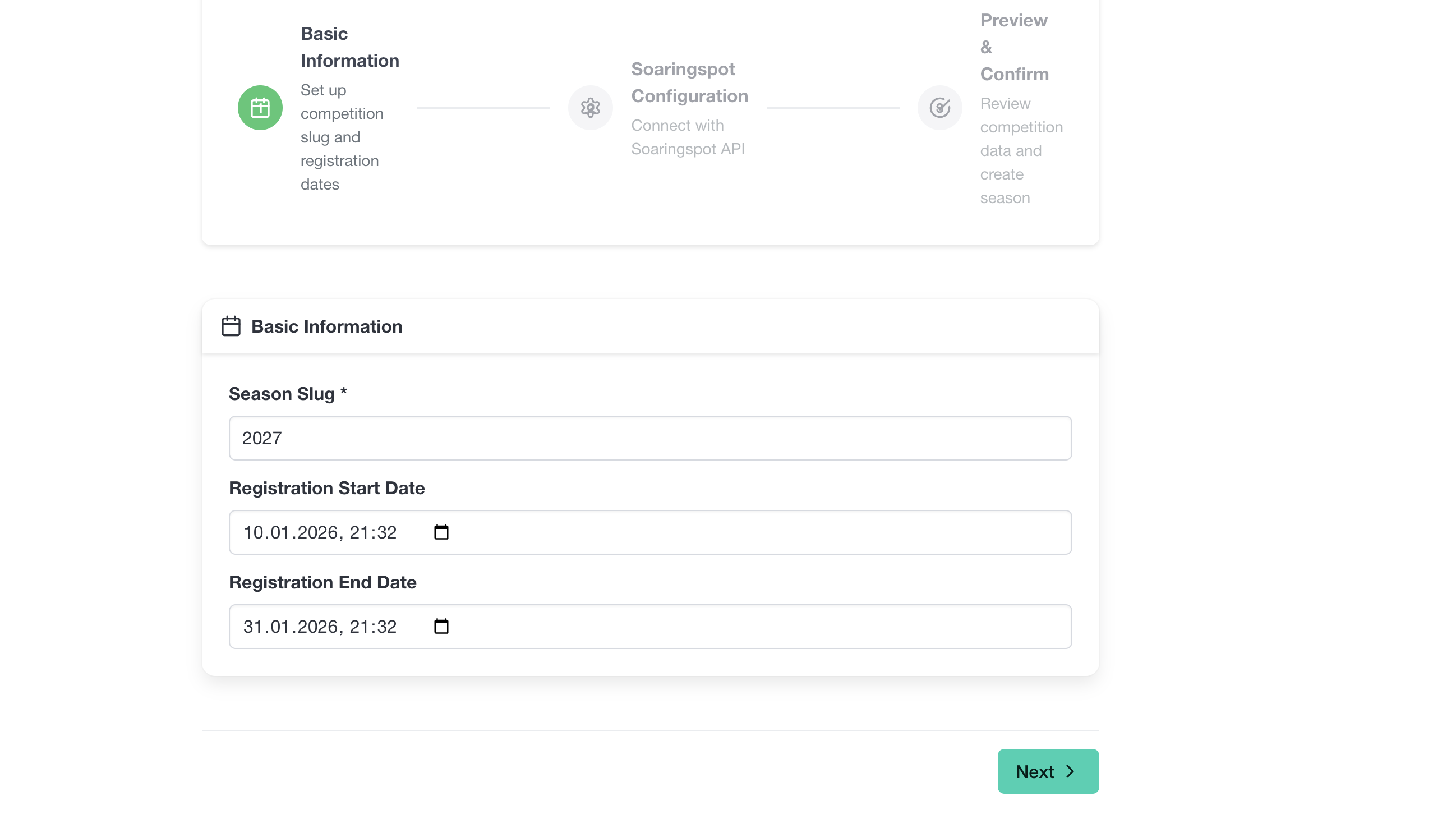 Create a new season, pass Soaringspot API credentials, set registration dates and optionally additional details.